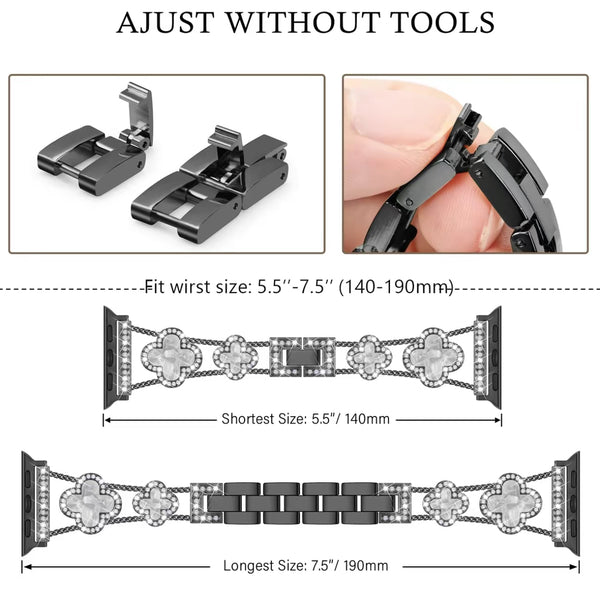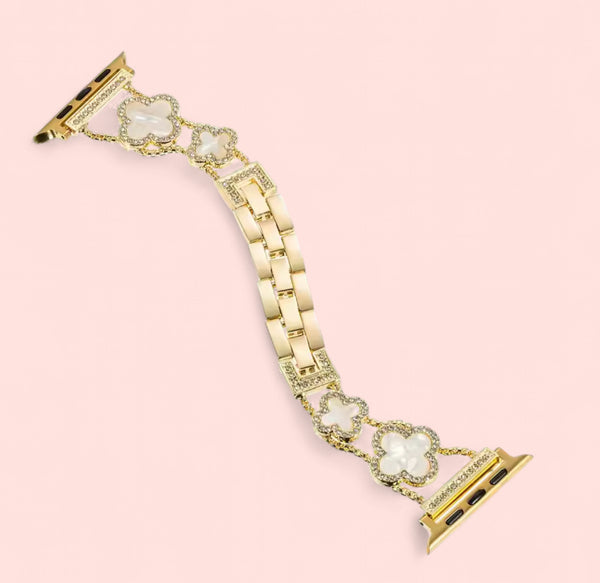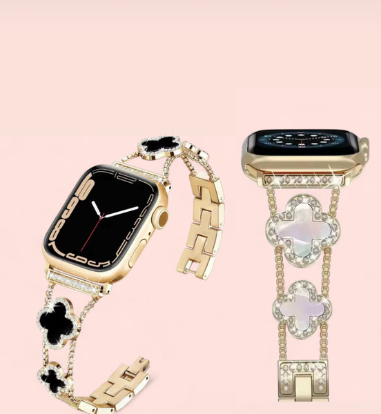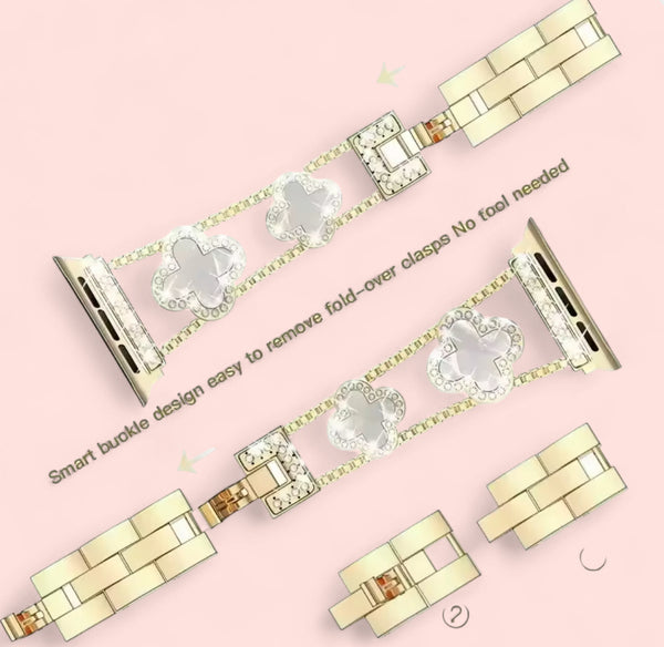 Crafted from durable stainless steel, this Apple Watch band features a stunning gold clover design. Elevate your style and stand out from the crowd with this eye-catching accessory. Designed to effortlessly match with any outfit, this band is the perfect blend of fashion and function.