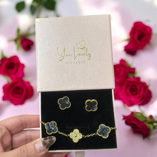 This Black and Gold Clover Stainless Steel Jewelry Set is a sophisticated and elegant addition to any ensemble. Featuring a stunning clover design, each piece is made of durable stainless steel. The necklace, earrings, and bracelet provide a timeless style that will complement any outfit. Perfect for anyone looking for a touch of luxury in their jewelry collection.