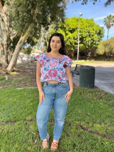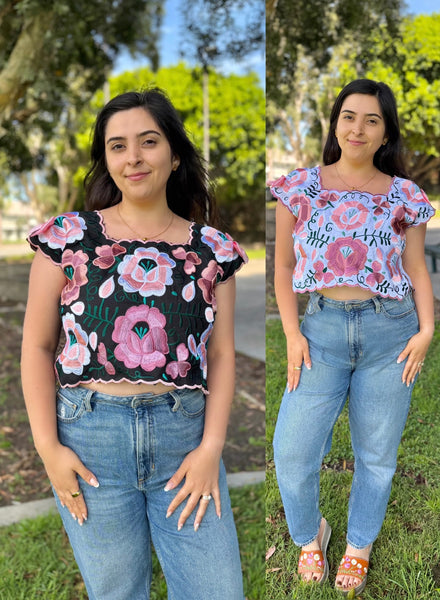 Fall in love with the perfect blend of tradition and trend. Our Divina Herencia Co "Coquetta" tops are a tribute to Mexican artisanal embroidery, reimagined with a modern, feminine twist. Crafted from elegant, structured taffeta and finished with dainty pink satin bows on the shoulders, these tops are designed to make a statement with a touch of luxury.