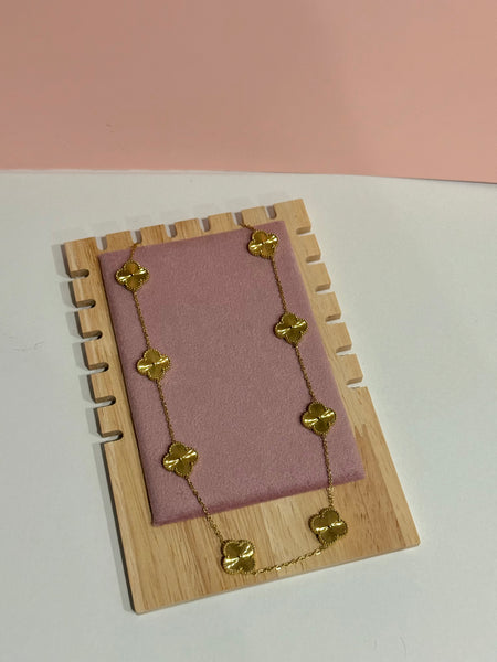 Experience timeless elegance with this Gold Clover Stainless Steel Jewelry Set. Made from durable stainless steel, this set includes a necklace, earrings, and bracelet featuring delicate clover designs. The perfect addition to any jewelry collection, this set adds a touch of sophistication to any outfit.