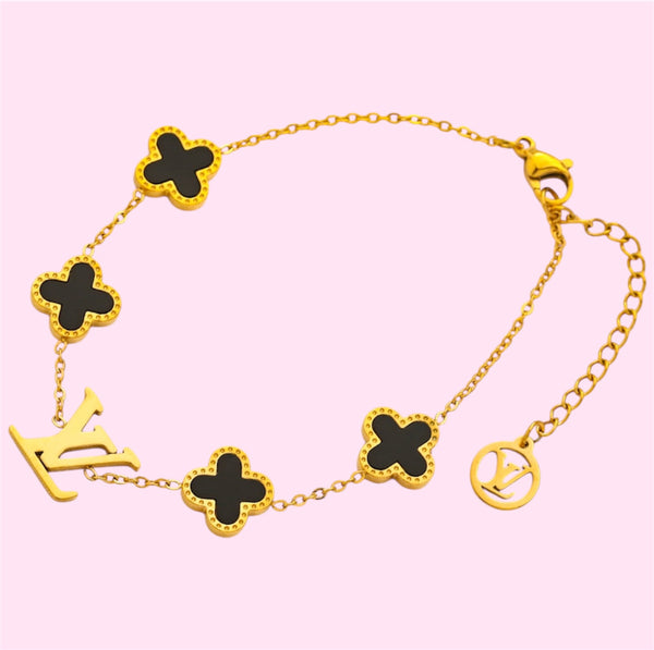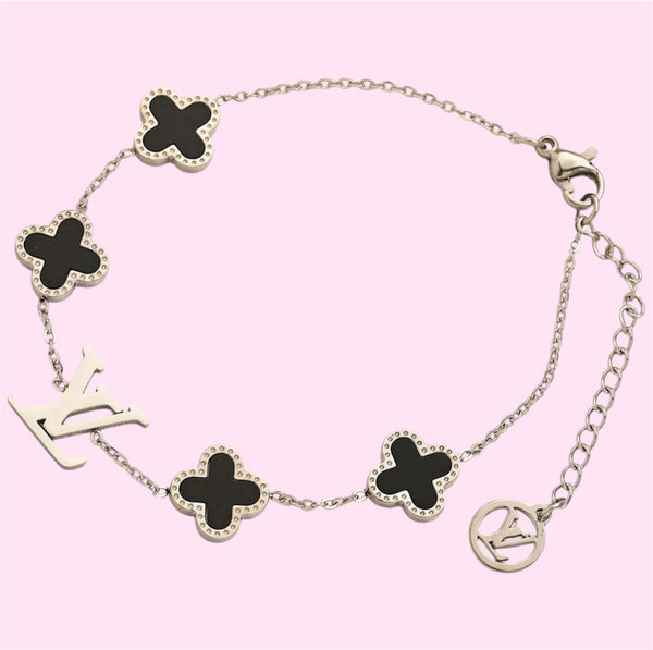 This LV Black Clover Stainless Steel Bracelet in Silver & Gold offers a unique blend of style and durability. Crafted from high-quality stainless steel, this bracelet features a sleek silver and gold design with a striking black clover accent. Elevate your look with this modern and versatile accessory that will elevate any outfit.