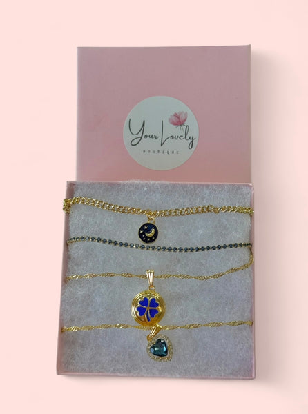 The beautiful necklace set comes with four gold chains with a touch of midnight blue. You need this in your jewelry collection.