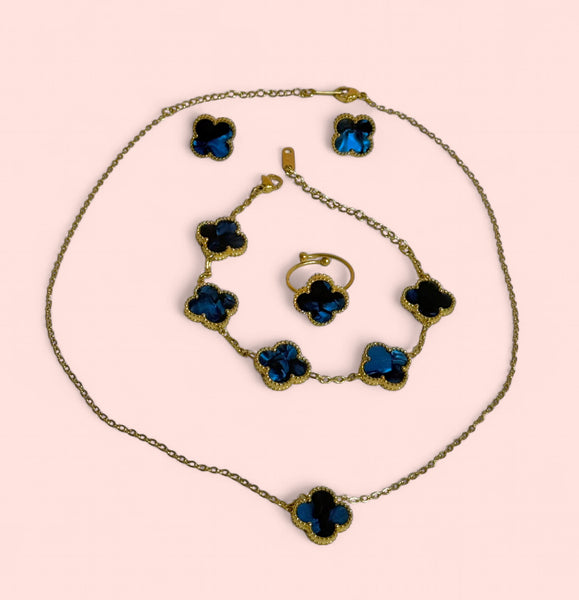 This Blue Clover Stainless Steel Jewelry Set includes a necklace, earrings, bracelet, and ring. Made with high-quality stainless steel, this set is durable and hypoallergenic. The elegant blue clover design adds a touch of sophistication to any outfit. Perfect for those with sensitive skin, this set offers both style and comfort.