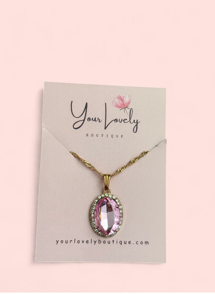 This Rosie Pink Rhinestone Pendant Gold Stainless Steel Necklace adds a touch of elegance to any outfit. Made with durable stainless steel and adorned with sparkling rhinestones, this necklace is both stylish and long-lasting. Elevate your style with this timeless piece.